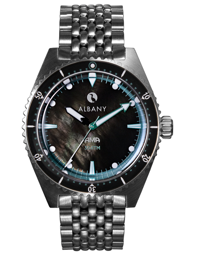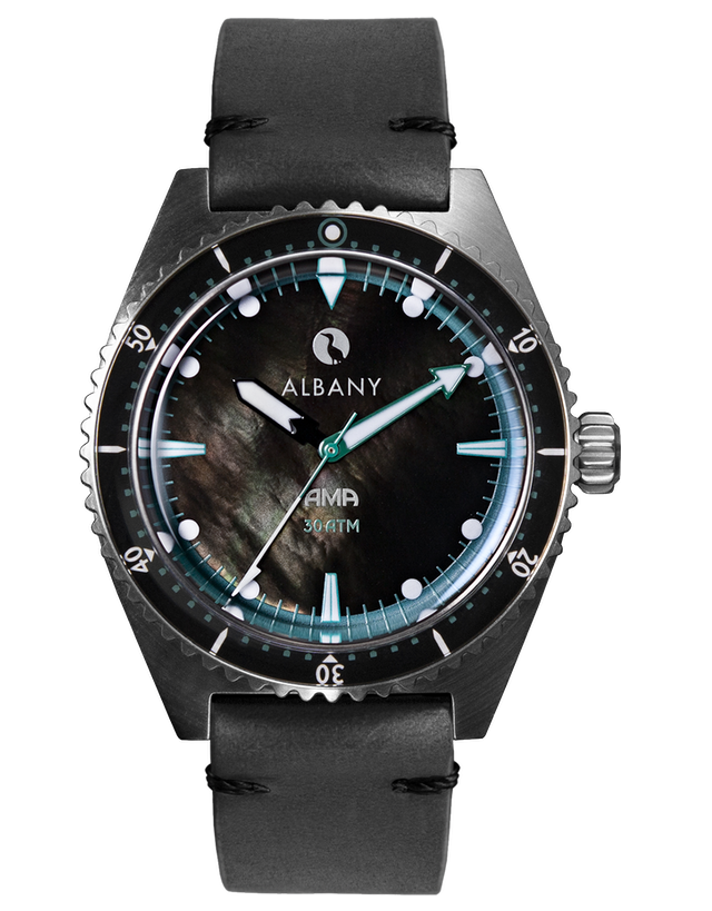 This is a Brand New Albany AMA Diver Mens Watch. It has a 40mm Stainless Steel Case, Black Pearl Dial on a Beads of Rice / Italian Leather / Eco Weave Strap. The watch is powered by Automatic Movement.