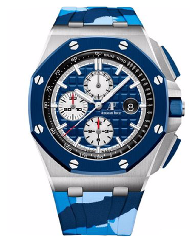 This is a New/Unworn Audemars Piguet Royal Oak Offshore Men’s Watch. It has a 44mm Stainless Steel Case, Blue dial on a Blue Rubber Strap. The watch is powered by Automatic movement.
