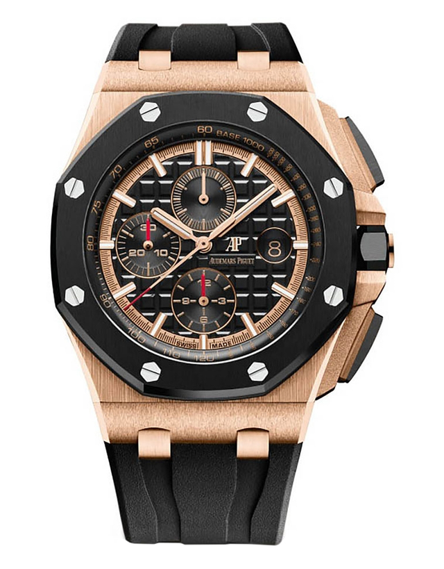 This is a New Unworn Audemars Piguet Royal Oak Offshore Men’s Watch. It has a 44mm 18kt Rose Gold Case, Black dial on a Black Rubber Strap. The watch is powered by Automatic movement.
