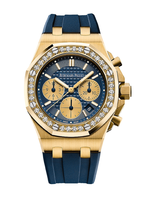 This is a Brand New/ Unworn Audemars Piguet Royal Oak Offshore Ladies Watch. It has a 37mm Yellow Gold Case, a Blue Dial with Lady Tapisserie Patterns on a Blue Rubber Strap with 18-Carat Yellow Gold AP Deployment Clasp. This watch is powered by Automatic Movement.