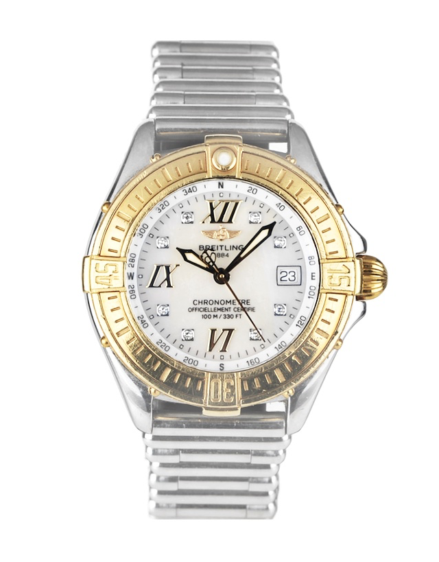 This is a Pre-Owned Breitling B Class Chronometer Ladies Watch. It has a 31mm Stainless Steel & Yellow Gold case, Mother of pearl Dial with Diamonds on a Stainless Steel Bracelet. The watch is powered by Quartz Movement.
