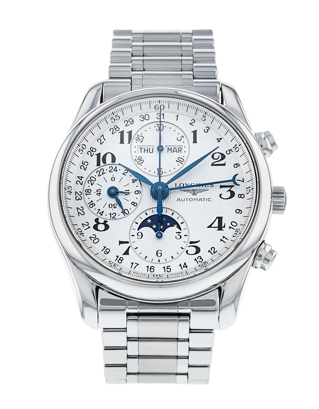 This is a Pre-Owned Longines Master Complications Mens Watch. It has 40mm Stainless Steel Case, Silver Arabic Dial on a Stainless Steel Bracelet. The watch is powered by Automatic movement.