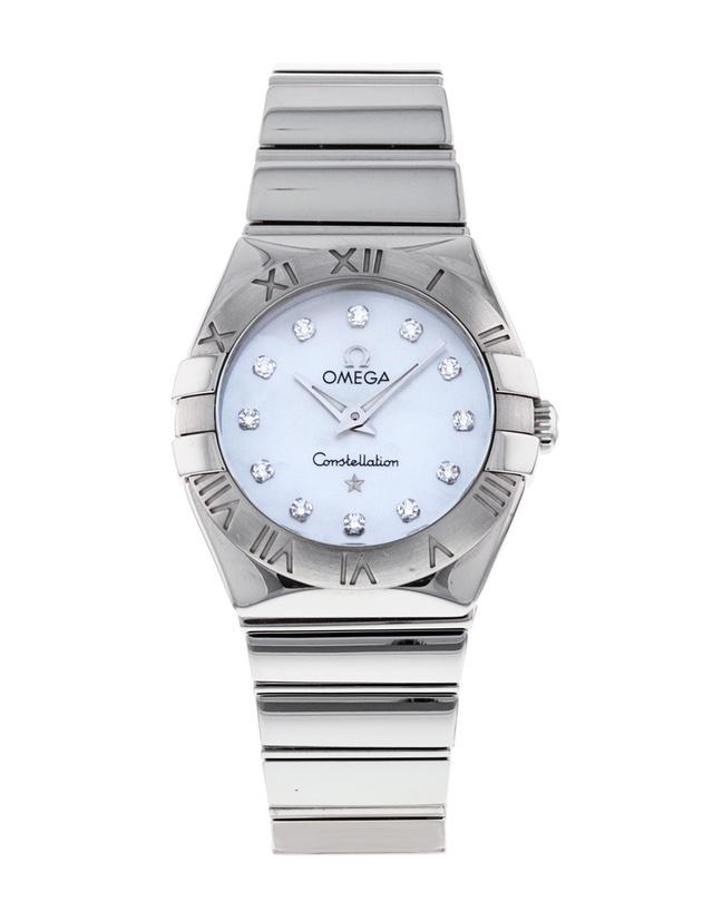 This is a Pre-Owned Omega Constellation Stainless Steel Ladies Watch. It has a 28mm Stainless Steel Case, Mother of Pearl White – Diamond dial on a Stainless Steel Bracelet. The watch is powered by Quartz movement.
