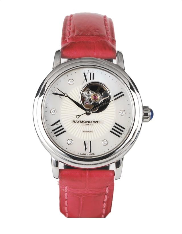 This is a Pre-Owned Raymond Weil Geneve Ladies Watch. It has a 29mm Stainless Steel case, Mother of Pearl White – Diamond dial on a Pink Leather strap. The watch is powered by Automatic movement.